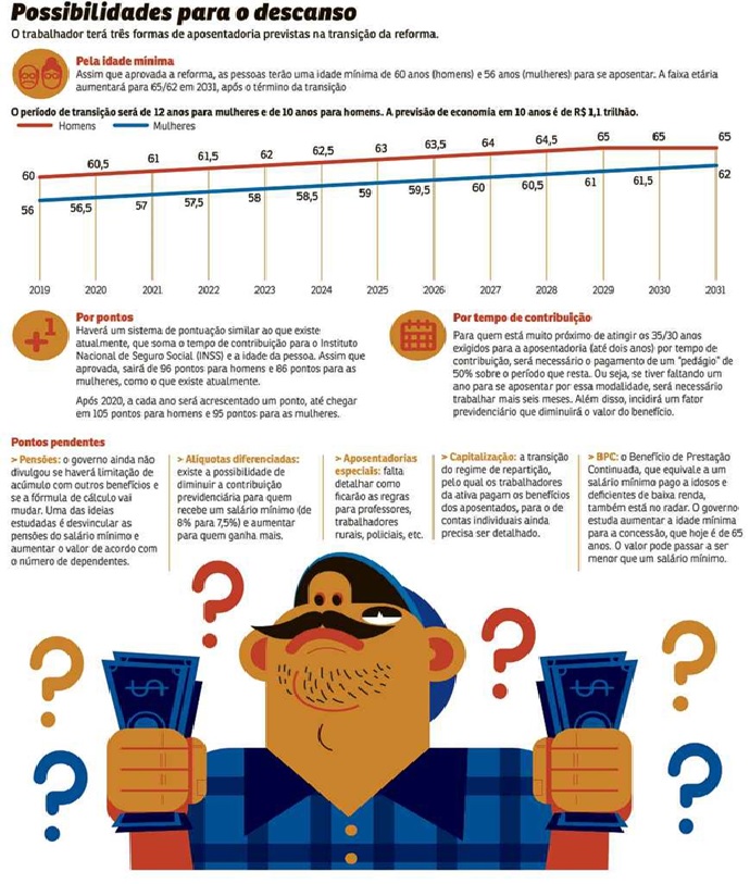 O presidente Jair Bolsonaro ainda precisa fechar os últimos detalhes, que incluem as definições sobre o que fará com esses benefícios, e deve divulgar o texto na próxima quarta-feira. Até agora, os únicos pontos garantidos são a idade mínima, de 65 anos para homens e 62 para mulheres, tanto para iniciativa privada quanto para servidores públicos; e a transição, que deve durar 12 anos. Assim que a reforma for aprovada, a exigência será de 60/56 anos.