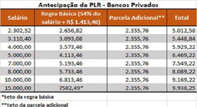 •  Regra Básica: 90% do salário + valor fixo de R$ 2.355,76. Caso o montante não atinja 5% do lucro líquido dos bancos o valor será elevado até o limite individual de 2,2 salários.