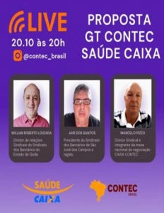 ração Nacional dos Trabalhadores em Empresas de Crédito – CONTEC fará nesta quarta-feira (20), às 20 h., uma live pelo Instagram @contec-brasil para fazer a apresentação da proposta do modelo de gestão e custeio do plano se assistência à saúde dos empregados da Caixa Econômica Federal, o Saúde Caixa, construída através do GT Saúde Caixa Contec com apreciação da mesa nacional de negociação.
