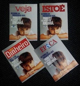 Com uma cara triste e o queixo amparado pelas mãos, um menino branco, de franja na testa, estampou as capas de quatro revistas semanais em fevereiro deste ano. O título – “Reforma da Previdência hoje. Para ele se aposentar amanhã.” – foi uma das últimas cartadas do governo para tentar emplacar o moribundo projeto, que seria definitivamente abortado dias depois. O que o governo diz agora é que as “sobrecapas publicitárias” de Veja, Época, IstoÉ e IstoÉ Dinheiro foram, na verdade, um presente das editoras. Detalhe: a ideia partiu delas.