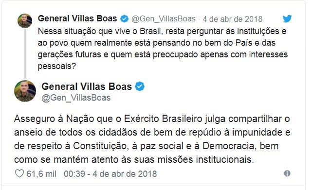 Relembre abaixo o tweet de Villas Bôas, do dia 3 de abril deste ano (Lula foi preso no dia 7 de abril, pouco depois do julgamento do STF):